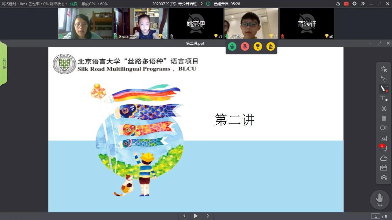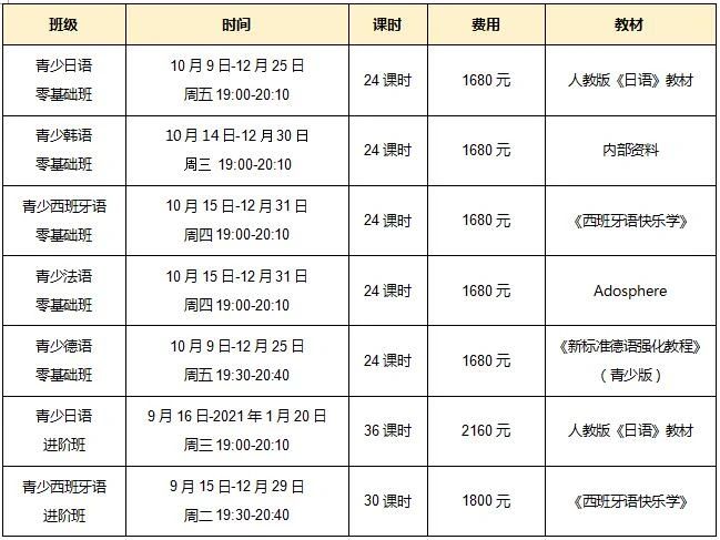 现有的成人培训课程,由于课时较长、授课思路逻辑性强、教学进度快,无法满足青少年的学习需求,因此,我部特开设青少小语种课程,旨在提供适合孩子的小语种课程。2020年暑假开设的小语种有日语和西班牙语。受疫情影响,所有课程均为在线直播课,课堂活跃,学生参与度高,通过第一阶段的学习,孩子们已经掌握了基本发音,并且能够使用所学语种进行简单对话。