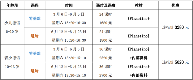 5-10岁及10-13岁德语课程均使用《Planetino》,是德国本土原版教材,共分《Planetino1》、《Planetino2》和《Planetino3》三套,配套有练习册和音频资料。教材内容寓教于乐,穿插小游戏,除了有助于激发孩子的学习兴趣,还引导孩子主动表达,锻炼听说和口语能力。模仿母语自然习得,练就正宗标准德语发音。课程采用互动式教学,全方面提高孩子的听说读写能力。有趣的课后练习帮助学员重复接触加深理解。
