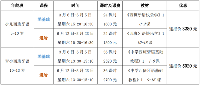5-10岁少儿西班牙语使用《西班牙语快乐学》,该教材是一套专门为儿童设计的西班牙语教程,共2册,学完后可以达到西班牙语初级水平(A1.1),每册书包含6个单元,18课,每单元后设置复习课。课文以日常生活为主题,精心安排游戏和练习让学生们在快乐中学习,在学习中享受快乐。练习册与学生用书配套使用,习题与课文内容紧密结合,书后精心设置“小词典”,通过剪贴画的方式帮助学生复习所学词汇。