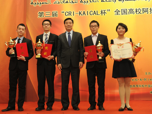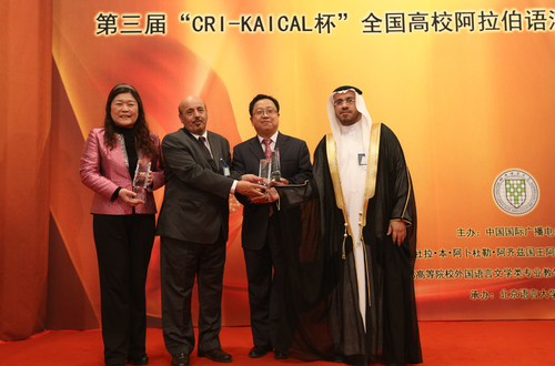 11月22日,由中国国际广播电台、教育部高等院校外国语言文学类专业教学指导委员会阿拉伯语分委会、沙特阿卜杜拉-阿卜杜勒-阿齐兹国王阿拉伯语国际服务中心联合主办的“第三届CRI—Kaical杯全国高校阿拉伯语演讲比赛”在我校落下帷幕。