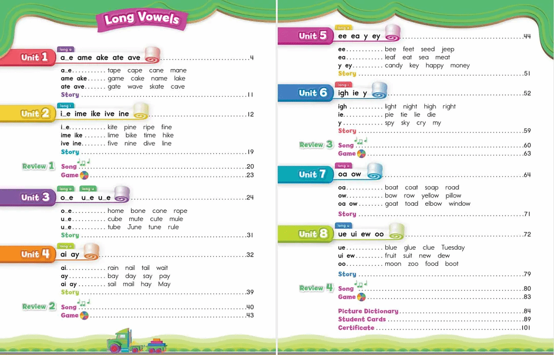 第三册为长元音拼读练习,本级别共八个单元,四个复习单元。学习单元主要讲解a,e,i,o,u的长音及双元音的发音,还有对应的单词的学习,如:tape, kite, home, rain, blue等。