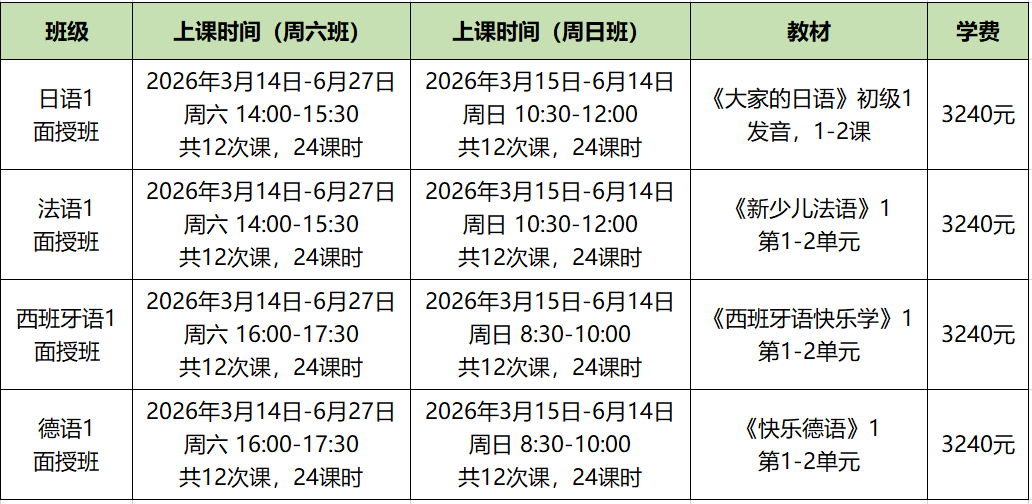 26年春季面授课程安排