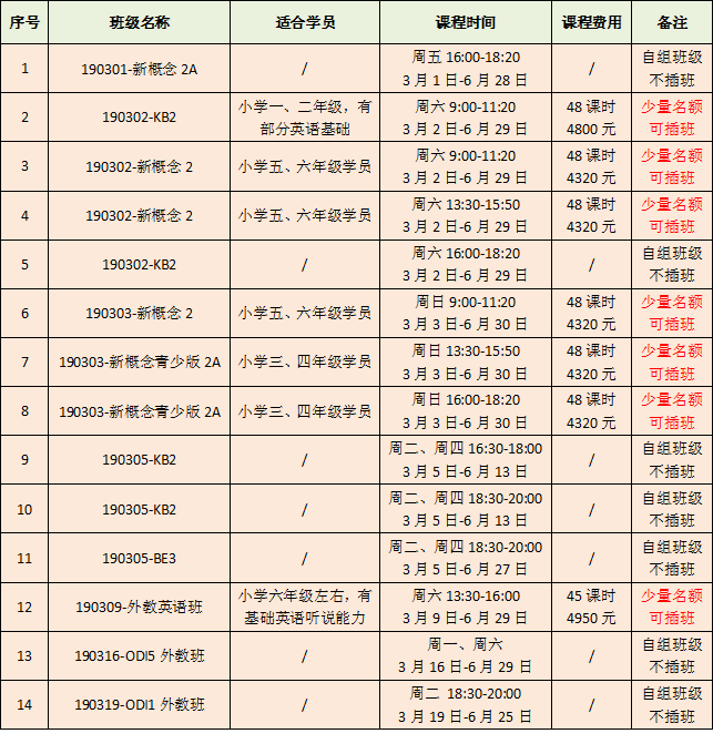 春季班开课在即,第一批开班以下14个英语班级,包括新概念课程、剑桥考级课程、外教口语课程等,尚有少数名额可插班,报名从速。