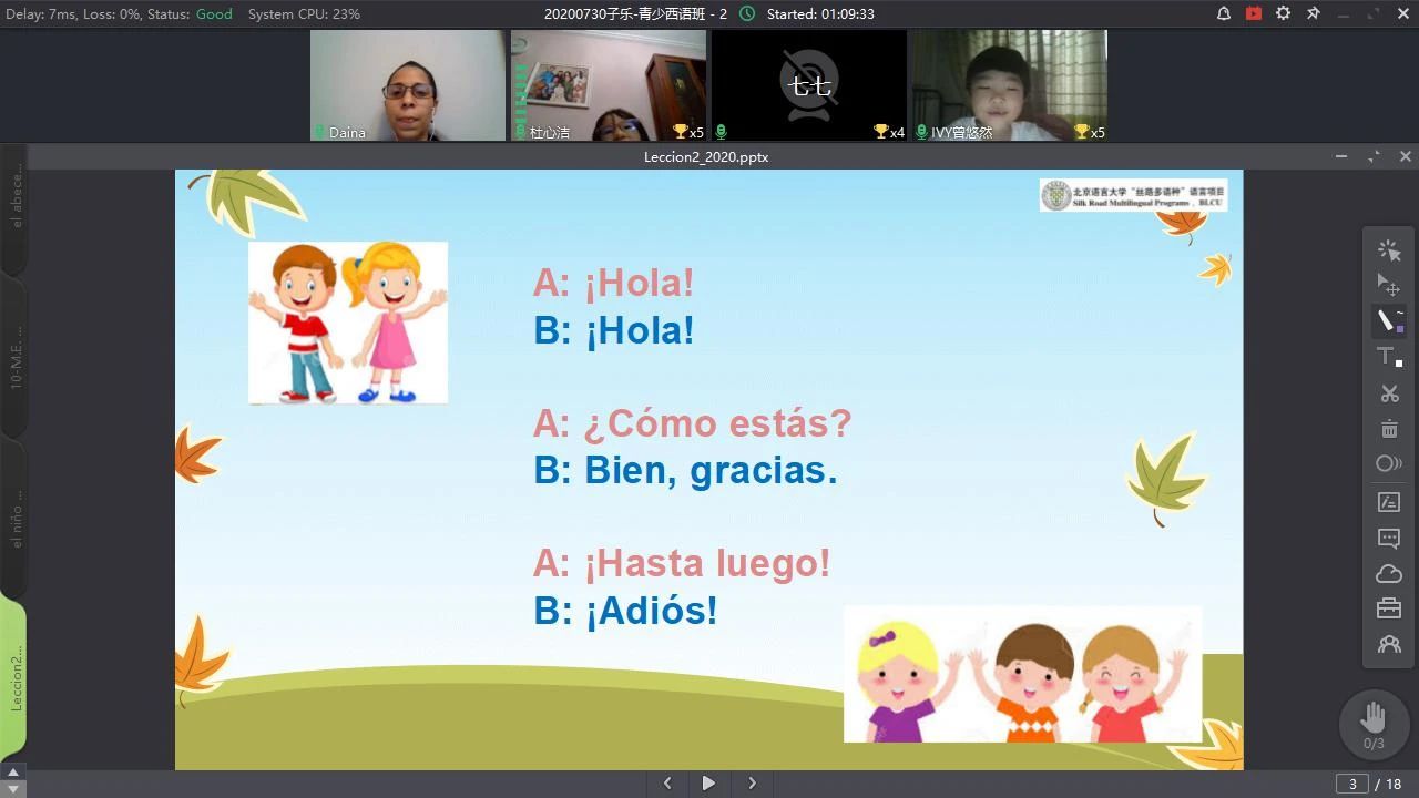 现有的成人培训课程,由于课时较长、授课思路逻辑性强、教学进度快,无法满足青少年的学习需求,因此,我部特开设青少小语种课程,旨在提供适合孩子的小语种课程。2020年暑假开设的小语种有日语和西班牙语。受疫情影响,所有课程均为在线直播课,课堂活跃,学生参与度高,通过第一阶段的学习,孩子们已经掌握了基本发音,并且能够使用所学语种进行简单对话。