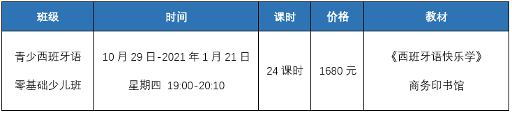 现有的成人培训课程,由于课时较长、授课思路逻辑性强、教学进度快,无法满足青少年的学习需求,因此,我部特开设青少小语种课程,旨在提供适合孩子的小语种课程。本期西班牙语课程专门针对5-10岁少儿设计,使用少儿西语教材《西班牙语快乐学》,全程直播授课,实时互动。