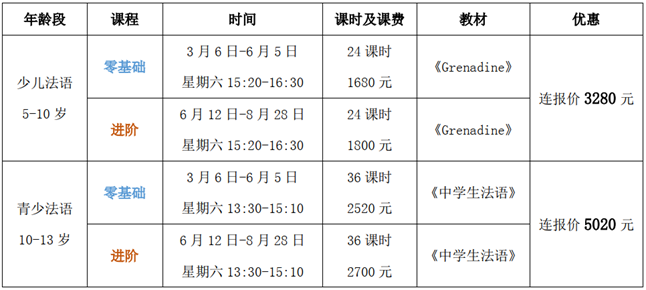 5-10岁少儿法语使用的教材为《Grenadine》,这是国内第一本少儿法语教材,为6-12岁少儿编写,学完后可以掌握数百个单词,基本的语法、句式、时态、日常口语表达和简单的句子书写,注重激发孩子兴趣,非常适合少儿法语的启蒙。配套音频资料可进行口语理解训练,利用各种听力材料学习词汇、语法和语音。结合教材,少儿法语课程注重通过歌曲和游戏进一步运用所学知识,更侧重于口语表达,通过连环画、游戏、手工等,在训练口语的同时,还增加了阅读理解训练。