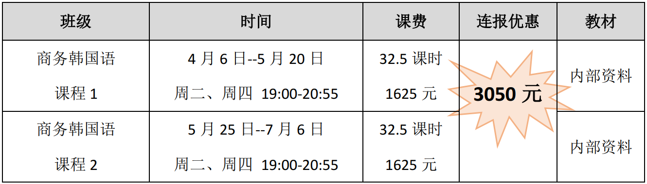 1.同时报名《商务韩国语课程1》、《商务韩国语课程2》优惠200元。