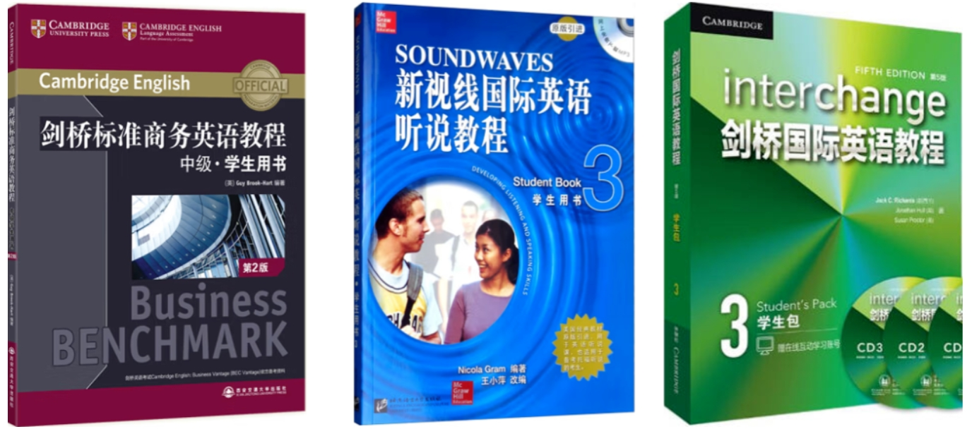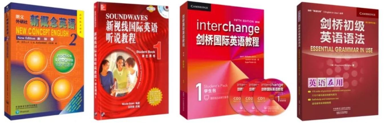 综合英语:《新概念英语》2 听说训练:《新视线国际英语听说教程》1 外教口语:《剑桥国际英语教程》1 语法(词法):《剑桥初级英语语法》 |