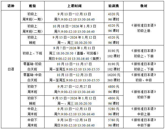 适合学员:零基础。对日语及其文化感兴趣,希望通过学习日语提高个人综合竞争力或有计划出国学习、旅游和工作的学员。