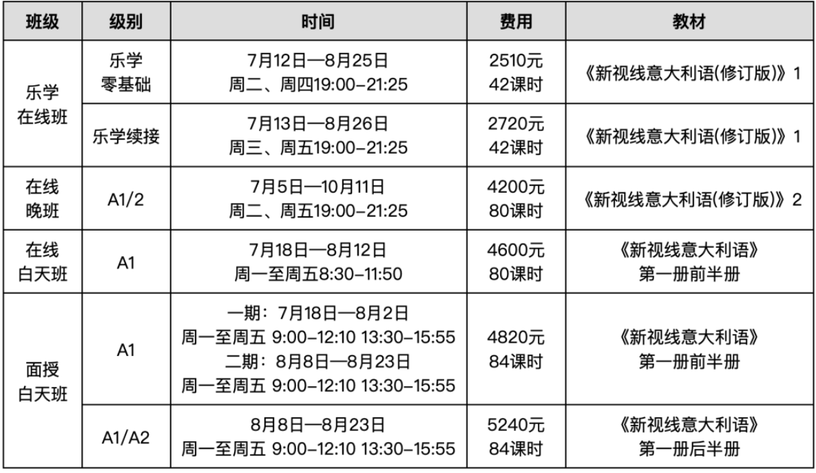 适合学员:零基础。对意大利语及其文化感兴趣,希望通过学习意大利语提高个人综合竞争力、出国进修音乐或艺术(如图兰朵计划、马可·波罗计划)、旅游和工作的学员(可开具使馆认可的学时证明)。