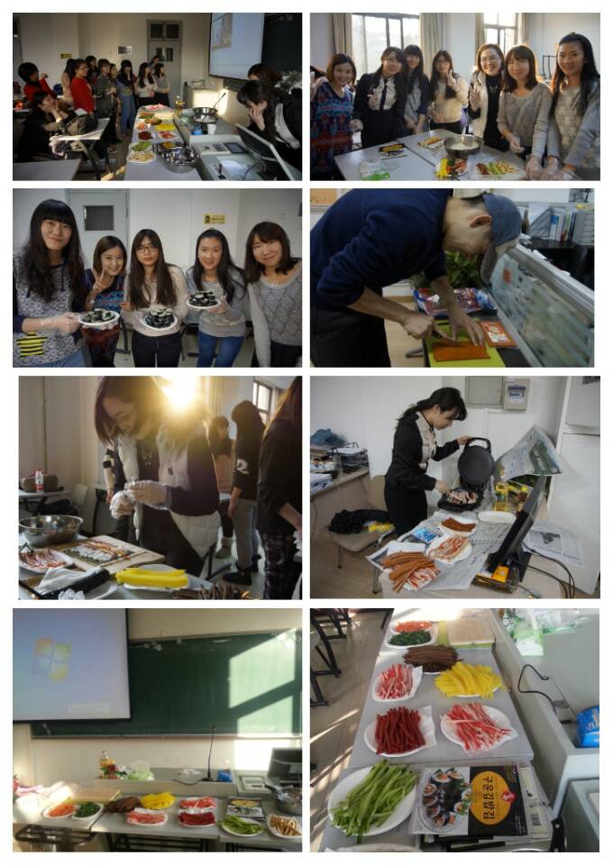2014年1月11日下午,北京语言大学培训学院韩语班的中外教,带领周末初级上和中级班的学生们一同制作紫菜包饭。大家边兴致勃勃地学习了和韩国食材、料理相关的词汇和表达,并且每个人都亲手制作了原汁原味的紫菜包饭,感受到了韩国饮食文化的魅力。寓教于乐的教学方式,给一学期充实的学习生活画了一个完美的句号。结课后很多学生纷纷表示,要继续学习韩语,也希望通过多种文化体验活动全面地了解韩国。2014年北语培训学院还将陆续开展和韩国服饰、饮食文化,以及法、西、德电影文化周等多种小语种文化体验活动。
