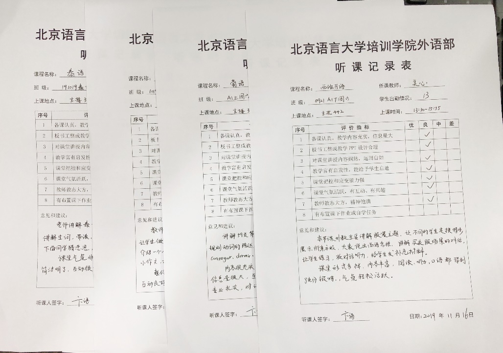 每个学期我们都会对所开设班级进行教学评估,为同学们发放二维码,手机扫码对老师进行在线的评估,外语部根据评估进行总结,对老师进行反馈。同时教务组也会安排进班听课,对任课教师进行督导反馈。
