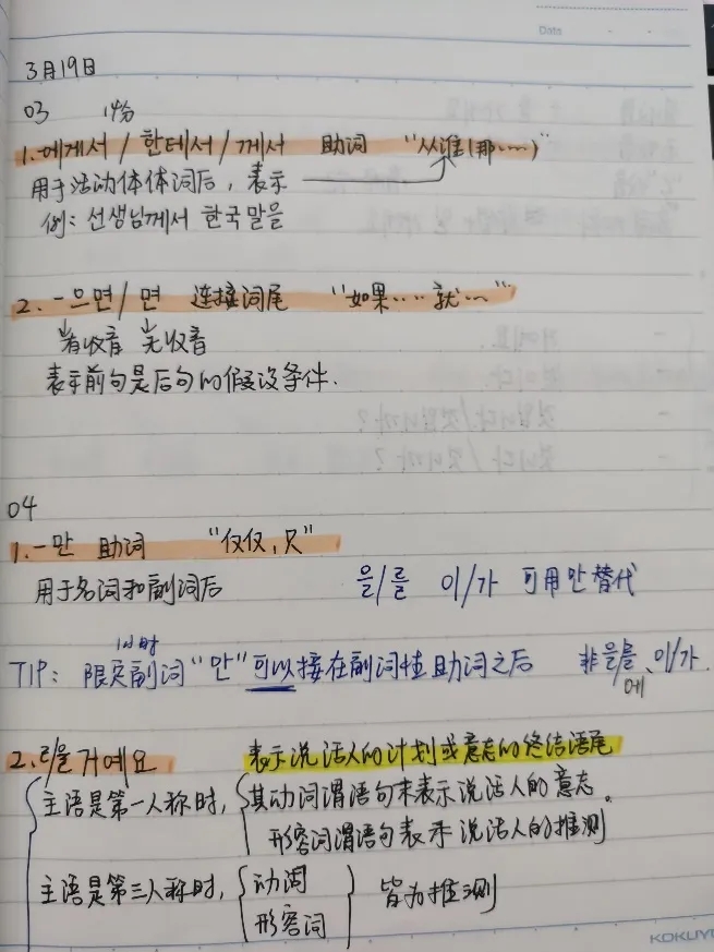 鉴于我备考TOPIK 考试的需求,吕老师帮我选取了延世韩国语这套教材,课上吕老师会针对每节课的两个语法,课文内容、新词汇以及与课文相关的韩国文化进行仔细讲解。根据直播课上的笔记,课下我会单独将所学新的知识点整理在笔记本上,并标好该知识点所在的单元及课数方便进行查找。直播课的好处是有回放,所以课上有哪些知识点我觉得较为重要或者较为复杂,会重复听取,并会把该语法点出现的时间标在该笔记的边上,方便迅速寻找回放,再次听取讲解。