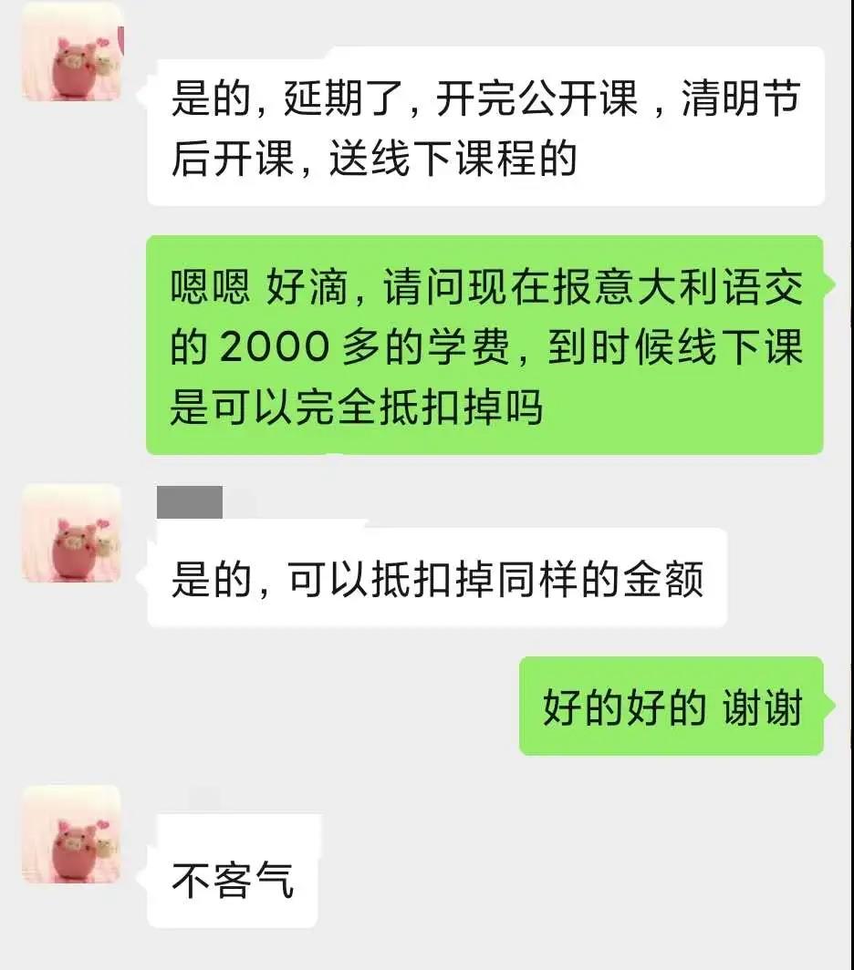 于是,我默默的潜入了光明正大扫码进入了培训学院提供的免费公开课的微信群里面(我依稀记得,我应该是蹭了韩语公开课,德语公开课,当然还有意大利语的公开课),暗中观察,准备报名。直到有一天早晨,我打开培训学院的公众号,发现了一条不太平凡的推送:《德、俄、意、阿线上课火热报名中:报线上,送线下!》,我开始也没太看懂,以为可能是赠送一节线下体验课吧,然后我在微信群里面又咨询了一下老师:
