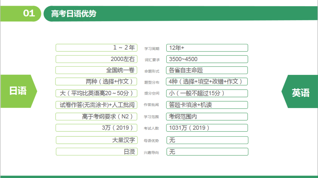 高考日语的考纲要求就比英语简单,像英语需要3500个词汇,日语只需要2000个词汇,如果高考想取得高分,英语需要4500个词汇,日语需要2500个词汇。