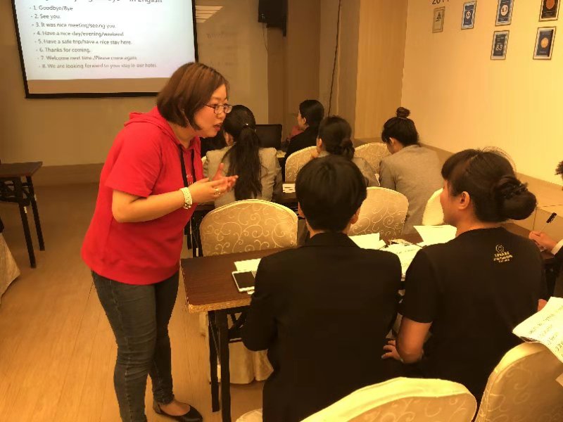到本周,第一期培训已经全部顺利完成,在结课测验及展示中,参训学员们的英语水平都有了突飞猛进的变化。在接待外宾、订房、退房、指路、电话预定、网络预订、团体接待、餐厅礼仪、投诉建议、客房服务、房间卫生与设施等工作场景下,都可以根据培训所学,展示出专业、职业的英语素养。目前,乾元酒店已经与我院就后续学习达成共识,并将于2019年1月正式开始第二期培训。