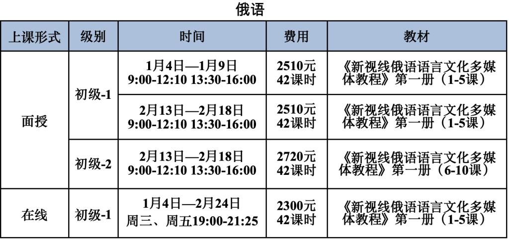 教 材:《新视线俄语语言文化多媒体教程》(1册),北京语言大学出版社。