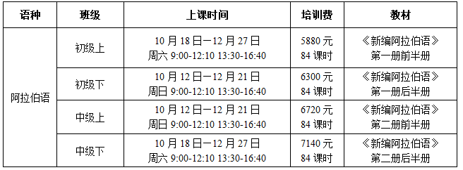 适合学员:学完《新编阿拉伯语》第二册(1-8课)或有阿拉伯语240课时基础,喜爱阿拉伯语言和文化,希望留学、移民、旅游或从事阿语国家贸易、工程建设工作的学员。