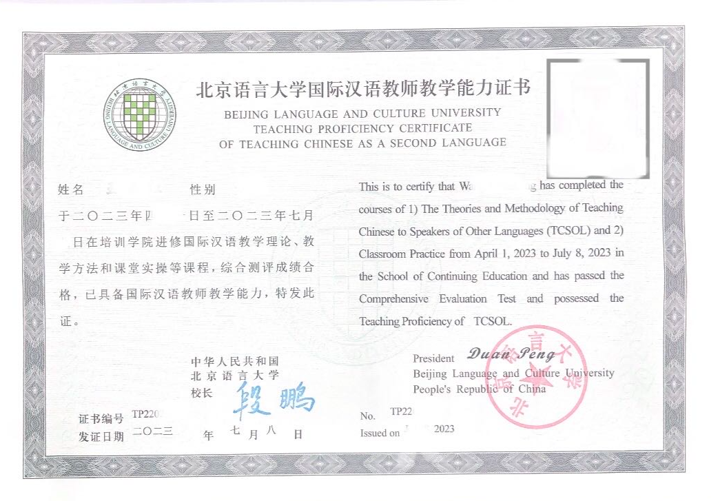 我校将为通过培训考核的学员颁发“北京语言大学国际中文教师教学能力证书”,以证明其具备我校承认的“国际中文教学能力”。